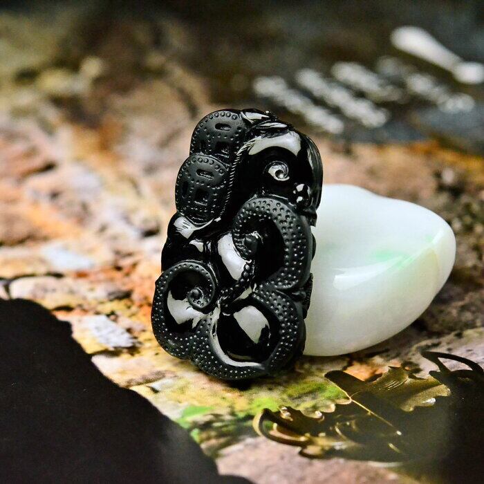 天然石 黒翡翠 龍・如意・古代銭 彫刻 根付 ペンダントトップ